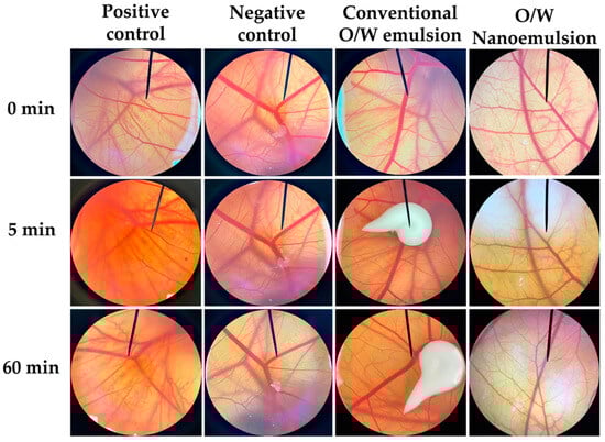 Photographs illustrating the effects of positive control (1% w/v sodium lauryl sulfate aqueous solution), negative control (0.9% w/v sodium chloride aqueous solution or normal saline solution), conventional O/W emulsion of M. integrifolia oil, and O/W nanoemulsion of M. integrifolia oil on the chorioallantoic membrane before exposure to the sample (0 min) and after exposure for 5 and 60 min.