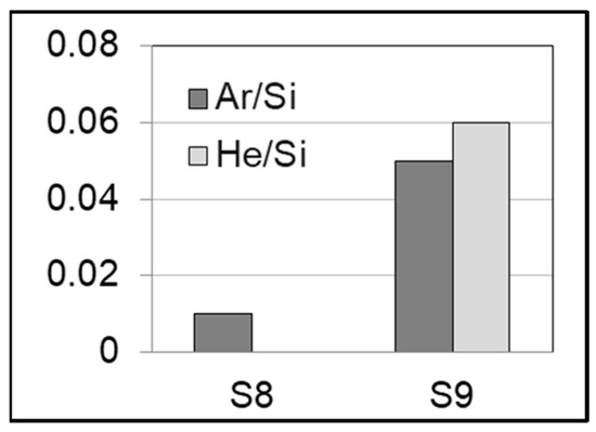 | Sample nr. Description | at% Si | at% Ne | at% Ar | at% He | Atomic Ratio Ne/Si or Ar/Si | Atomic Ratio He/Si |