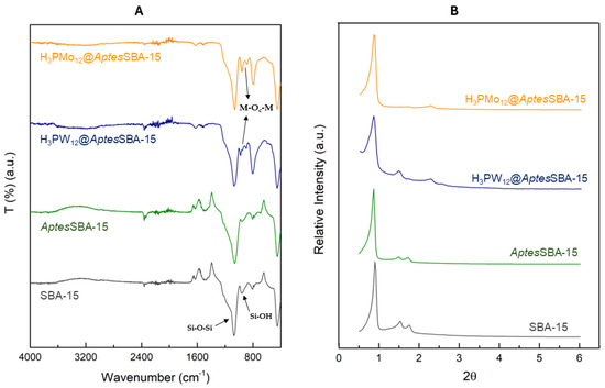 The SBA-15 and AptesSBA-15 support presented zeta potentials of −17.5 mV and 29.3 mV, respectively. These values were consistent with the literature, where the change of signal (from negative to positive) has been reported to occur due to the successful functionalization of the amino groups on the support surface [23]. Elemental analysis of AptesSBA-15 further confirmed the surface functionalization, yielding 2.4% nitrogen, corresponding to 1.1 mmol of Aptes per g of material. The FTIR-ATR spectra of the prepared materials are shown in Figure 1A, where the characteristic vibration modes of the silica support can be observed in the region 1100–400 cm−1, namely for the νas (Si-O-Si), νs (Si-O-Si), and δ (Si-O-Si) vibrations [24]. The presence of amino groups in the 1200–1000 cm−1 region could not be identified due to overlap with the siliceous support vibrational modes [25]. Furthermore, the characteristic band around 1510 cm−1, corresponding to N–H stretching vibrations, attributed to aminopropyl functionalization groups, could not be distinguished when comparing SBA-15 and AptesSBA-15 spectra [26]. This is probably due to the low amount of Aptes on the surface of SBA-15. The incorporation of HPAs in the prepared composites was confirmed through the identification of the vibration bands at 1000–960 cm−1 and 800–760 cm−1, corresponding to νas (M=Od) and νas (M-Oc-M) vibration modes, respectively [26]. Furthermore, the incorporation of HPAs in the composites was confirmed through ICP-OES analysis where loadings of 159 and 188 µmol of HPA per g of the composite were obtained for H3PW12@AptesSBA-15 and H3PMo12@AptesSBA-15, respectively.