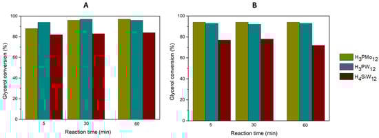 Glycerol conversion results obtained for the three homogeneous catalysts (H3PMo12, H3PW12, and H4SiW12), using a ratio of 1:15 glycerol/acetone, a catalyst acidity of 0.373 mmol H+/g, at (A) 25 °C and (B) 60 °C.