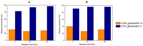 Glycerol conversion results obtained for the two composite catalysts (H3PMo12@AptesSBA-15 and H3PW12@AptesSBA-15), using a ratio of 1:15 glycerol/acetone, normalized catalyst acidity of 0.373 mmol H+/g, at the reaction temperature of (A) 25 °C and (B) 60 °C.