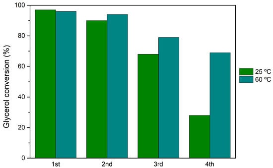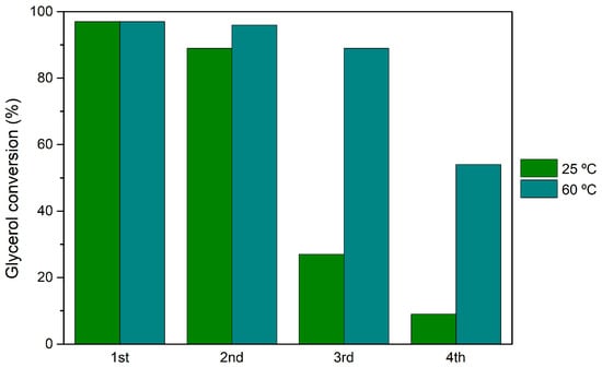 Glycerol conversion results obtained after 1 h of glycerol acetalization with acetone, using H3PW12@AptesSBA-15 catalyst, after four consecutive recycling cycles. Reactions performed using a ratio of 1:15 glycerol/acetone, normalized catalyst acidity of 0.373 mmol H+/g, at the reaction temperature of 25 and 60 °C.