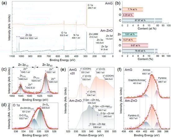 AmG and Am-ZnO chemistry examination by means of core-level methods: (a) Survey spectra and (b) bar chart displaying the elemental composition of AmG and Am-ZnO layers. (c) Zn 2p and (d) O 1s high-resolution XPS spectra of the Am-ZnO. (e) O K-edge XAS and (f) N 1s high-resolution XPS spectra of the AmG and Am-ZnO samples.