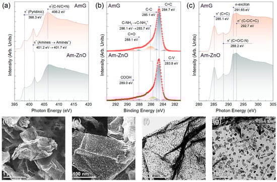 Apart from the aforementioned spectral features, a prominent C-NH2 peak with a BE of 286.1 eV can be discerned in the AmG spectrum, which shifts to a lower BE of 285.7 eV in the case of Am-ZnO. Such alterations hint once again at the reduction in the electron density on the nitrogen atom as a sequence of the amine protonation. Although the peaks of basal-plane hydroxyls and epoxides, as well as edge-located hydroxyls, are known to contribute to the discussed range of BEs, possibly affecting the position of the C-NH2/C-NH3+ peak, the effect of these features is negligible because no signs of their presence can be discerned in either the C 1s XPS spectra or the C K-edge XAS spectra (Figure 3c). No π* resonance can be observed for edge-located hydroxyls around a PE of 286.5 eV, nor can epoxide- and hydroxyl-related resonances of the basal-plane epoxides and hydroxyls at PEs of 287.3 eV and 289.6 eV, respectively [59,72]. In turn, prominent π* (C=C) resonance at a PE of 285.1 eV and σ-exciton at a PE of 291.65 eV are clearly present, representing characteristic signs of maximal elimination of the oxygen groups and a high degree of graphene network recuperation, even in the presence of up to 5–7 at.% concentrations of amines.