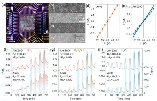 Given the information on the morphology and chemistry of AmG- and Am-ZnO, both materials were tested as a gas-sensing layer for the multisensor e-nose chips applied over the Si substrate equipped with multiple co-planar electrodes (see Materials and Methods). Figure 4a exhibits an optical photo of the developed chip composed of the AmG layer, exhibiting the same morphology as the one based on Am-ZnO. Figure 4b,c display the morphology of the AmG and Am-ZnO layers, respectively, in their thinnest parts. As one can see, the deposited films in both cases are presented as arrays of overlapping Am/Am-ZnO flakes, 1–10 μm in size, forming a conductive layer to cover the substrate and the measuring electrodes. Notably, the wrinkling of the flakes discussed in previous sections can be clearly seen, yielding a higher specific surface area of the gas-sensing layer. To verify the ohmic contact between the graphene-based layers and the measuring electrodes, the current–voltage characteristic (I-V) was recorded in dry air (Figure 4d,e). For the AmG layer, a linear I-V curve was observed, whereas slight non-linearity with a mismatch between the forward and backward scans was observed in the Am-ZnO case. We assumed that this was related to the formation of the Schottky barrier at the hybrid interface between the ZnO NPs and the AmG layer due to the work function differences (3.37 eV and 4.3 eV, respectively [14,23]), which further significantly separated the charge carriers and promoted the spatial charge transfer via the built-in electric field [15]. This fact is also reflected by a significant (more than one magnitude) enhancement of the layer’s average resistance upon moving from AmG to Am-ZnO, from ca. 370 Ω to ca. 8000 Ω, as observed by comparing the I-V characteristics of the materials under study. Thus, the acquired I-V curves imply the absence of significant potential barriers at the interface between the gas-sensing layer and the measuring electrodes, while also indicating the possible formation of an Am-ZnO p-n heterojunction interface, enhancing sensitivity towards gas molecules.