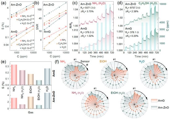 The gas-sensing performance of multisensor chips composed of AmG and Am-ZnO layers: (a) Chemiresistive response and (b) SNR magnitude of the exemplary sensor elements versus the concentrations of NH3, C2H5OH, and H2O; dash–dot lines refer to AmG, while dashed lines correspond to Am-ZnO. (c,d) The resistance transients of the exemplary sensors exposed to (c) NH3 and (d) C2H5OH in humid air, 25 rel.%. (e) The median chemiresistive response of the multisensor arrays to the test analytes in the both dry and humid air. (f) The normalized raw vector signals, as radar patterns, generated by the sensor arrays to all of the studied analytes in dry and humid air; AmG is orange, while Am-ZnO is dark cyan. S values for the AmG layer are additionally multiplied by a factor of 7 for explicit comparison of the AmG and Am-ZnO patterns in the radar diagram.