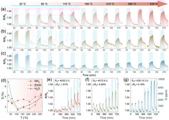 The temperature effect in the 30–310 °C range on the chemiresistive effect of the Am-ZnO-based multisensor chip: (a–c) The R(t) transients for the typical sensor elements of the chip under various operating temperatures while being exposed to (a) NH3, (b) C2H5OH, and (c) H2O. (d) The response value, S, dependent on the operating temperature. (e,f) The R(t) transients recorded while exposing the Am-ZnO chip to (e) NH3, (f) C2H5OH, and (g) H2O after high-temperature treatment.