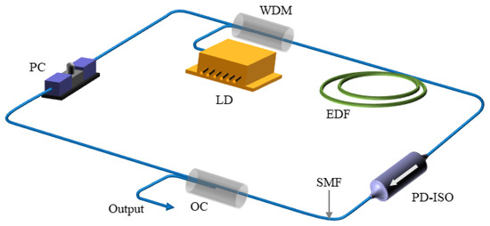 Schematic diagram of experimental setup. WDM: wavelength division multiplexer; OC: output coupler; EDF: erbium-doped fiber; PC: polarization controller; PD-ISO: polarization-related isolator.