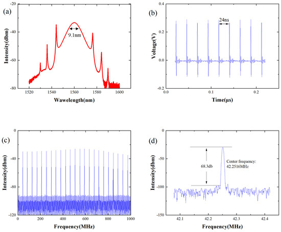 At a pump power of 70 mW, adjusting the PC angle and screws appropriately results in the laser operating in a stable mode-locked state. By maintaining a fixed PC setting and increasing the pump power to 80 mW, the effects of intracavity dispersion-induced broadening and nonlinear effects-induced compression counterbalance each other [19,20], leading to a constant pulse width and shape, thus forming a soliton pulse that retains its shape and intensity during transmission. The laser self-starts, with the corresponding pulse characteristics depicted in Figure 2. The spectrum exhibits a conventional soliton profile centered at 1560.076 nm with a 3 dB spectral width of 9.1 nm (see Figure 2a). A stable pulse sequence with a pulse interval of 23.7 ns was obtained using an oscilloscope (see Figure 2b). Subsequently, the pulse repetition frequency signal was measured (see Figure 2c), revealing a repetition frequency of 42.2516 MHz and a fundamental frequency signal-to-noise ratio of 68.3 dB (see Figure 2d).