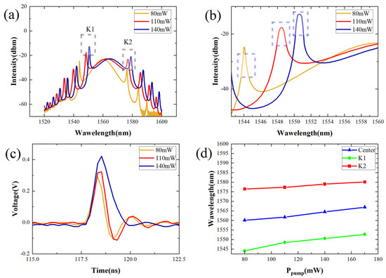 The spectrum and the pulse characteristics without changing the PC. (a) Increase the pump power to 80 mW, 110 W, and 140 mW for the output light spectrum; (b) enlarged first Kelly sideband K1; (c) single pulse sequence; (d) the relationship between pump power and the position of center wavelength and Kelly sidebands.
