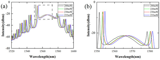 To verify the occurrence of spectrum shifts and explore pulse characteristics under different conditions, we incrementally increased the pump power from 200 mW to 255 mW to observe the spectrum (see Figure 4). Shifts in spectra and Kelly sidebands were observed. The spectrum at a pump power of 200 mW (see Figure 4a) displayed a central wavelength of 1564.5 nm and a 3 dB bandwidth of 8.8 nm. The first Kelly sideband was enlarged (see Figure 4b), and the shift in the Kelly sideband was clearly evident. Notably, we observed that as pump power increased or decreased, the number of pulses also correspondingly increased or decreased.