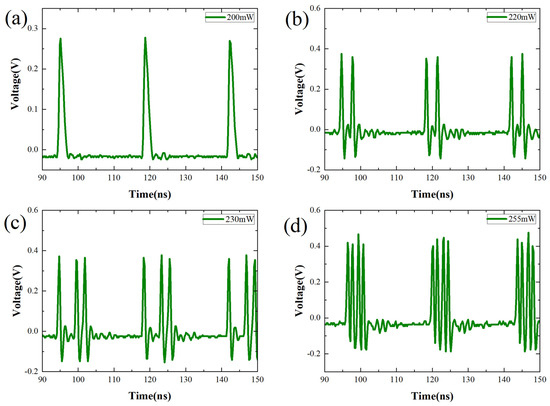 When the pump power exceeds 200 mW, a notable phenomenon of pulse splitting emerges. As illustrated in Figure 5, a single pulse undergoes division into multiple pulses. Through the experiment, diverse multi-soliton states were achieved by elevating the pump power beyond 200 mW. Specifically, as the pump power escalates from 200 mW to 255 mW, solitons are sequentially generated, manifesting as 1, 2, 3, and 4 pulses, as depicted in the figure. Beyond 255 mW, the pulse sequence transitions into an irregular state.