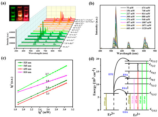 Figure 1b displays the fluorescence spectrum of NaYF4: Er (12.5 mol%) @NaYF4 under varying laser excitation powers. It can be concluded that the luminous intensity increases with the rise in excitation power. According to the logarithmic relationship between the luminescent intensity and excitation power (Figure 1c) of NaYF4: Er(12.5 mol%) @NaYF4 irradiated by a laser with different powers at 1550 nm, the luminescence of green light (525 nm and 545 nm), red light (655 nm), and near-infrared light (810 nm) exhibits three-photon absorption, three-photon absorption, three-photon absorption, and two-photon absorption, respectively. The same conclusions apply to NaErF4 @NaYF4 and NaErF4: Tm (0.5 mol%) @NaYF4 (Figure S1). The results indicate that the luminescent intensity of upconversion is influenced by the addition of varying concentrations of rare-earth ions, while the upconversion mechanism remains consistent across all emission regions (Figure 1d).