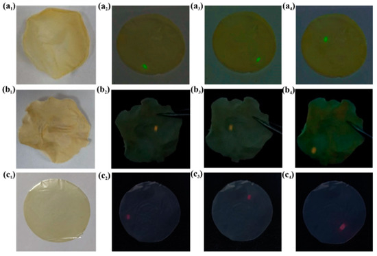 Figure 7(a1,b1,c1) display the digital pictures of self-supported UCNP/KNF composite films fabricated by incorporating 30 wt.% of NaYF4: 12.5%Er @NaYF4, NaErF4 @NaYF4, and NaErF4: 0.5%Tm @NaYF4, respectively, under ambient lighting conditions. The composite films in the low-light environment underwent irradiation using a 1550 nm laser (12.5 W/cm2) at various positions, as illustrated in Figure 7(a2–a4,b2–b4,c2–c4). Distinct luminescence can be observed at various locations on the film when exposed to laser irradiation. The results indicate that UCNPs are evenly distributed within the composite film, leading to satisfactory luminescent performance of the composite film. Consequently, this material is anticipated to be utilized in the field of exhibition.