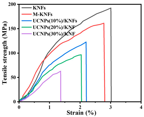 Comparative tensile stress–strain curves of pure KNFs, pure M-KNFs, and UCNP/KNF composite films with different contents of UCNPs.
