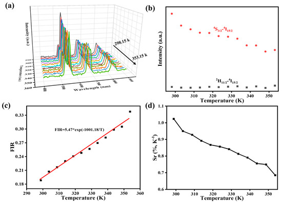 Temperature-dependent luminescence characterization of UCNPs/KNFs: (a) upconversion spectra of UCNP/KNF films upon 1550 nm (2.5 W/cm2) at different temperatures; (b) dependence of the integrated intensities of 4S3/2–4I15/2 and 2H11/2–4I15/2 emissions on temperature; (c) temperature-dependent FIR of UCNPs/KNFs; (d) temperature sensitivity of UCNPs/KNFs as a function of temperature.