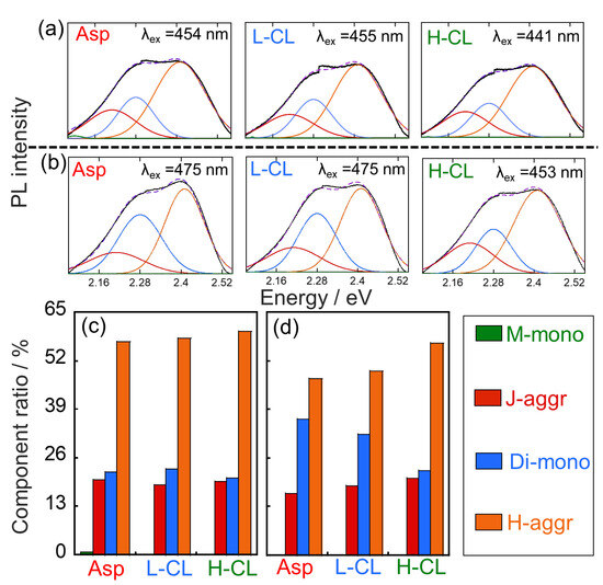 (a,b) Luminescence spectral separation results for four aggregate states and (c,d) the component ratios for four aggregate states calculated with the spectra of the FS−-immobilized ASPs washed with (a,c) EtOH and (b,d) IPA.