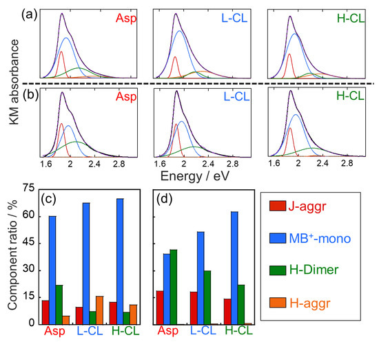 (a,b) UV-Vis diffuse reflectance absorption spectral separation results for four aggregate states and (c,d) component ratios of the MB+-immobilized ASPs washed with (a,c) EtOH and (b,d) IPA.