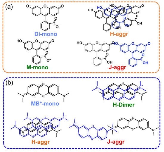 To investigate the immobilization molecular state of FS− and MB+ on the particles, PL spectrophotometry for FS− and diffuse reflectance absorption spectrophotometry for MB+ were used in this study. For FS−, the PL spectra were recorded under the excitation wavelengths of 440–450 nm in the PL range of 480–600 nm. Spectral peak separation and deconvolution were conducted for the evaluation. In particular, FS− and MB+ show the molecular aggregation states as shown in Scheme 2. FS− can take the aggregation structures of monomeric monoanion (M-mono), J-aggregate (J-aggr), monomeric anion (Di-mono), and H-aggregate (H-aggr) (Scheme 2a), and MB+ can take the aggregation structures of J-aggregate (J-aggr), monomer (MB+- mono), H-dimer (H-dimer), and H-aggregate (H-aggr) forms (Scheme 2b). Based on the above molecular aggregation states, the FS− and MB+ immobilized on the particles were determined separately and deconvoluted with the four components on the basis of previous reports (Table 1) [13,14,15]. All the deconvolutions were performed by fitting with the Gaussian function conducted through the Experimental Procedure S1. Then, the area of the spectrum of each component was divided by the total area of the measured spectra to determine the proportions (%).