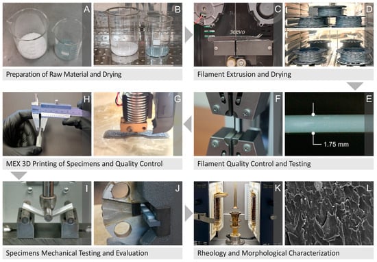 (A,B) Preparation procedure and drying of the raw materials, (C–F) filament extrusion, drying, inspection of quality and mechanical properties test, (G,H) manufacturing of the 3D-P specimens via MEX and inspection of their quality, (I,J) mechanical testing and evaluation of the specimens, as well as (K,L) their rheology and morphological characterization.