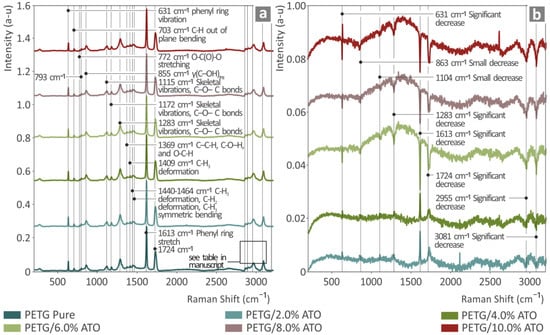 (a) Raman spectra of pure PETG, PETG/2.0 wt.% ATO, PETG/4.0 wt.% ATO, PETG/6.0 wt.% ATO, PETG/8.0 wt.% ATO, and PETG/10.0 wt.% ATO; (b) results after subtracting pure PETG from all the PETG/ATO composites.