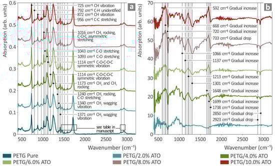 (a) ATR/FTIR spectra from pure PETG, PETG/ATO 2 wt.%, PETG/ATO 4 wt.%, PETG/ATO 6 wt.%, PETG/ATO 8 wt.%, and PETG/ATO 10 wt.%, (b) ATR/FTIR spectral differences in PETG/ATO 2 wt.%, PETG/ATO 4 wt.%, PETG/ATO 6 wt.%, PETG/ATO 8 wt.%, and PETG/ATO 10 wt.% from PETG/pure.