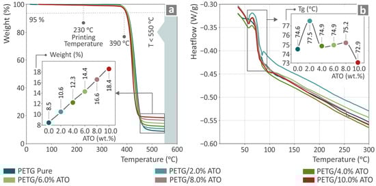 Results from the thermal properties investigation of neat PETG and PETG/ATO (2.0, 4.0, 6.0, 8.0, and 10.0 wt.%) composites by (a) TGA and (b) DSC graphs.