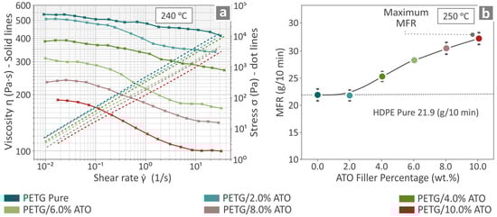 Results regarding neat PETG and the PETG/ATO (2.0, 4.0, 6.0, 8.0, and 10.0 wt.%) composites when tested for (a) viscosity and stress, as well as (b) MFR.