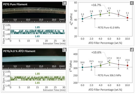 (a,b) Images of the fabricated pure PETG and PETG/4.0 wt.% ATO filaments and the monitoring of their diameters, (c) results from the tensile strength and (d) tensile modulus of elasticity of pure PETG, and all PETG/ATO composites.