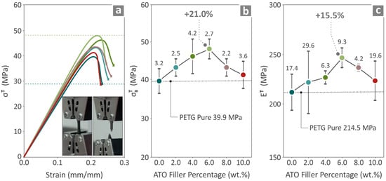The tensile properties of the pure PETG and PETG/ATO 2.0, 4.0, 6.0, 8.0, and 10.0 wt.% are presented in Figure 8. Figure 8a shows the tensile stress on the strain graph and the two images taken before and after testing a randomly chosen specimen. Figure 8b,c present the tensile strength and tensile modulus of elasticity results, respectively, where the highest values above those of pure PETG are found in PETG/6.0 wt.% ATO, 21.0%, and 15.5%, respectively.