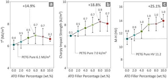 Results regarding the values of neat PETG and all the PETG/ATO composites as to the (a) tensile toughness, (b) Charpy impact strength, and (c) M-H.