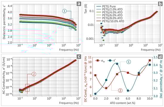 The real part of dielectric permittivity (ε’), the dissipation factor tan(δ), and the real part of ac-conductivity (σ’) in the measured frequency range of pure PETG and PETG/ATO nanocomposites at various filler contents (0–10% wt.) are shown in Figure 11a–c. The dielectric permittivity of pure PETG demonstrates minimal frequency dispersion across the measured frequency spectrum, i.e., ε’ increases gradually from 2.8 at 4 MHz to 3.3 at low frequencies, in agreement with previously reported values [103]. With increasing ATO content up to 10% wt., no significant spectral changes were observed over the entire frequency range, whereas did not show any considerable change, varying from 2.8 to 3.4, as depicted in Figure 11d. This observation implies that the dielectric behavior of PETG/ATO composites is mainly determined by the properties of the polymer matrix.