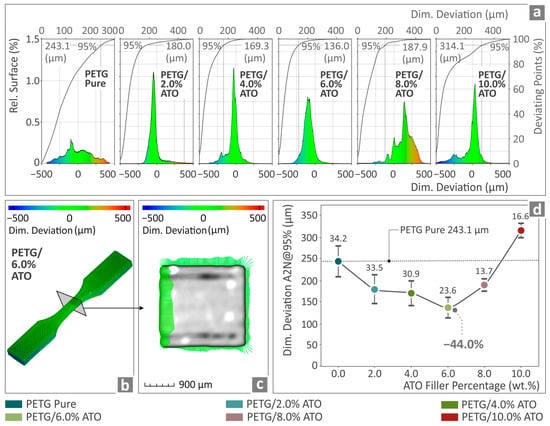 (a) Micro-computed tomography results regarding the dimensional deviation of pure PETG, PETG/2.0 wt.% ATO, PETG/4.0 wt.% ATO, PETG/6.0 wt.% ATO, PETG/8.0 wt.% ATO and PETG/10.0 wt.% ATO; (b,c) structural deviation of a PETG/6.0 wt.% ATO tensile specimen by color-coded mapping; (d) A2N dimensional deviation at 95% of pure PETG and all the PETG/ATO composites.