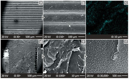 Figure 7 shows the results of the quality inspection of the prepared filaments. Figure 7a,b show images of the fabricated pure PETG and PETG/4.0 wt.% ATO filaments, respectively, as well as the results from the recording of their diameter during their fabrication. Both filaments were characterized by smooth surfaces, while their diameters were kept steady between 1.65 mm and 1.85 mm. Figure 7c,d show, respectively, the values of the tensile strength and tensile modulus of elasticity of the pure PETG/ATO filament samples, respectively. It can be seen that the PETG/6.0 wt.% ATO presented the highest value of both tensile strength (16.7% above pure PETG) and tensile modulus of elasticity (10.6% above pure PETG).