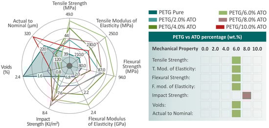 In Figure 12d, the values of the A2N at a 95%-dimensional deviation of pure PETG and all the PETG/ATO samples are shown. The lowest value, below that of the pure PETG, was observed at PETG/6.0 wt.% (44.0% lower). Only PETG/10.0 wt.% ATO presents a higher value than that of pure PETG. The addition of the filler to the matrix material improved the dimensional deviation of the rest of the composites in relation to that of pure PETG, indicating a positive influence. At the same time, the composite with the highest dimensional accuracy also showed the highest overall mechanical performance among the materials tested, suggesting a possible connection between 3D printing quality and mechanical performance.