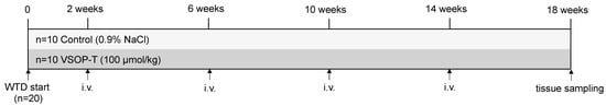 Relative body weight development of control and VSOP-T-treated mice over the period of 18 weeks on a Western-type diet. Means ± SD are shown (n = 10 animals per group).