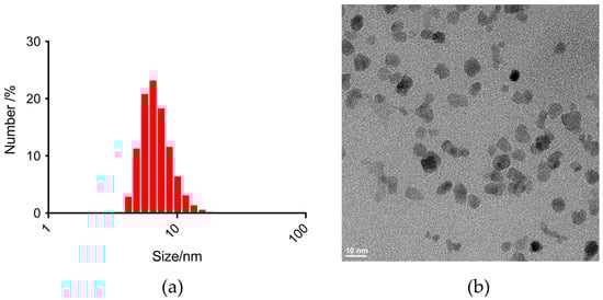 Nanoparticles exhibited a hydrodynamic diameter of 7.1 ± 2.0 nm (Figure 2a,b) and demonstrated water relaxivities of r1 = 16.9 L·mmol−1·s−1 and r2 = 37.5 L·mmol−1·s−1. The formulation had an osmolality of 455 mOsm/L, and the pH was adjusted to 6.8–7.2 using meglumine, resulting in a final meglumine concentration of 0.212 g/L. The particles displayed a surface-bound citric acid content of 14.15 ± 0.047 g per 100 g of iron. Particle synthesis was conducted multiple times to establish reproducibility, and VSOP-T remained stable for several years under neutral pH conditions. Repeated size measurements revealed no evidence of aggregation or the presence of larger peaks, confirming the enduring stability and uniformity of the particles.