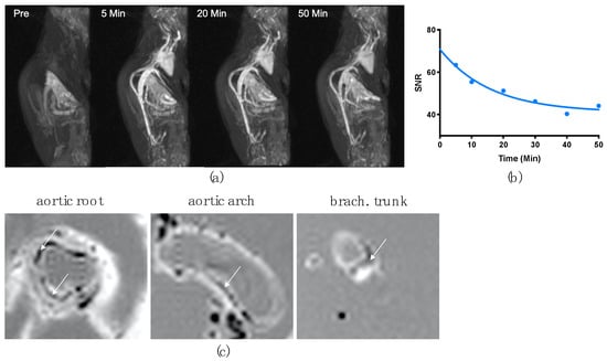 Intravenous injection of 100 µmol Fe/kg VSOP-T in anesthetized mice enabled the angiographic imaging of heart and blood vessels with a blood half-life of one hour (Figure 3a,b). Immediately after intravenous injection, heart, aorta, and vena cava showed a strong positive contrast, proving that VSOPs are a feasible alternative for Gd-containing contrast media for MRI imaging. Consistent with our prior studies [], iron accumulation in atherosclerotic vessel segments was confirmed using T2*-weighted ex vivo MRI scans 24 h post-injection. Intravenous application of VSOP-T caused a distinct signal loss within atherosclerotic plaques of the aortic root, aortic arch, and its branches (Figure 3c).