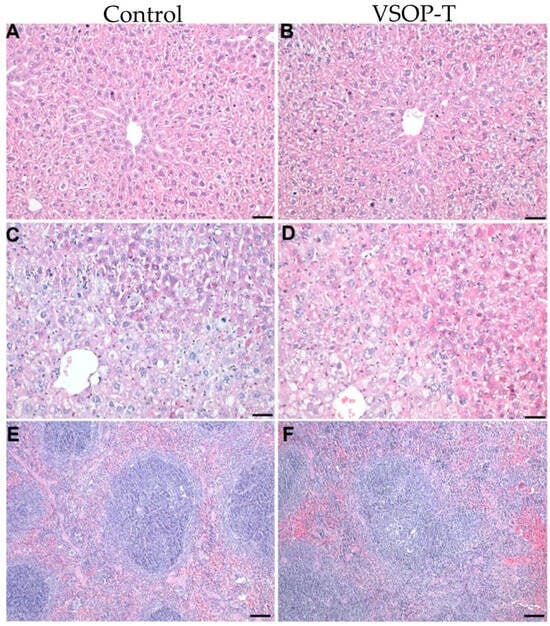 VSOP-T had no adverse hepatic or splenic effects. The characteristics of the hepatic lesions varied within the model; however, they were unaffected by the type of group. The hepatocytes of ApoE KO mice showed minimal (A,B) or severe vacuolization (C,D). In severely affected livers, the hepatocytes were variably sized, and the hypertrophied cells were predominately located centrolobular (C,D). The treatment with VSOP-T (B,D) had no effect on the hepatic phenotype. No differences were observed between the spleens of control (E) and VSOP-T-treated mice (F). Bars (A–D) = 50 µm. Bars (E,F) = 100 µm.