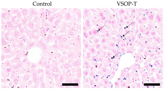 Visualization of iron in the hepatic sinusoidal lining cells. Compared to the liver of mice of the control group, the cytoplasm of hepatic sinusoidal lining cells of VSOP-T-treated mice stained intensively blue by Prussian blue staining (arrows). Bar = 50 µm.