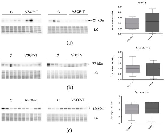 Analyses of hepatic expressions of proteins relevant for iron transport and recycling by Western blot: ferritin (a), transferrin (b), and ferroportin (c). Left panels show the Western blot results of 10 control mice (C) versus 10 VSOP-T mice (VSOP-T) separated on two membranes. Amido black staining served as loading control (LC). The right panels show the respective signal intensity analysis.