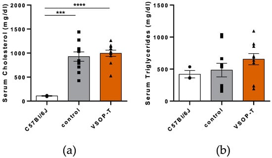 Serum cholesterol (a) and triglyceride levels (b) of control and VSOP-T-treated ApoE KO mice on HFD (n = 10 mice per group). For comparison, serum cholesterol and triglyceride levels of C57Bl6/J mice on normal diet (n = 3) were included in the diagrams. Data are shown as mean ± SD and individual data points. *** p < 0.001; **** p < 0.0001.