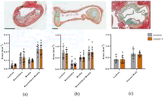 Movat pentachrome staining and histological evaluation of vascular segments from (a) brachiocephalic trunk, (b) aortic arch, and (c) aortic root of control (circles) and VSOP-T-treated mice (squares) (n = 10 mice per group). Data are shown as mean ± SD and individual data points. Bar = 250 µm.