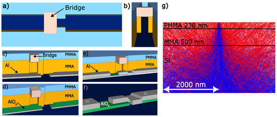 Schematic representation of the pattern transferred onto a double-layer resist stack followed by an aluminum deposition process, delineating the steps involved in fabricating Josephson junctions, alongside electron trajectory simulation within the resist layers. (a) Dolan Josephson junction scheme showcasing the exposed area (in dark blue) and the central bridge region (in grey). (b) Bird’s-eye perspective of the anticipated Josephson junction bridge structure. (c) Initial angle deposition, (d) oxidation phase, (e) subsequent angle deposition. (f) Representation of the Josephson junction post-lift-off process, with the green coating symbolizing the layer. (g) Visualization of electron dispersion trajectories in a 230 nm PMMA layer (top) and a 500 nm MMA co-polymer layer (bottom), both situated on a silicon substrate, under the influence of a 30 kV electron beam. The trajectories of the primary electrons from the incident beam are depicted in blue, whereas the backscattered electrons are illustrated in red.