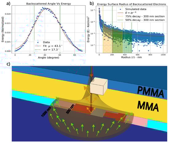 To elucidate the role of backscattered electrons, the distribution of energy was analyzed with respect to both the scattering angle, as depicted in Figure 2a, and the radius of energy distribution, as shown in Figure 2b. The analysis revealed that the scattering angle’s energy deposition is best modeled by a normal distribution, with the most probable scattering angle centered around . However, electron scattering occurs throughout the beam’s path, necessitating an examination of the cumulative effect of this scattering, represented by the radius of the backscattered energy surface. By fitting the data to a power-law decay, described by the relationship , we derived the equation E(r) = to characterize the energy distribution’s decay. The analysis of this distribution indicates that while incident electrons exhibit a well-defined resolution, backscattered electrons influence a broader region. This observation aligns with expectations, as the electron beam is focused down to a 10 nm radius and is subsequently dispersed in all directions upon scattering, giving origin to the backscattered electrons.