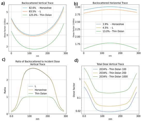 Analysis of dose factors and the ratio of the backscattered to total incident dose for various geometries investigated in this study. (a) Distribution of the backscattered electrons along a vertical trace. (b) Distribution along a horizontal trace. (c) Ratio of backscattered to incident dose over the vertical trace. (d) Dose variation observed in a thin Dolan geometry.