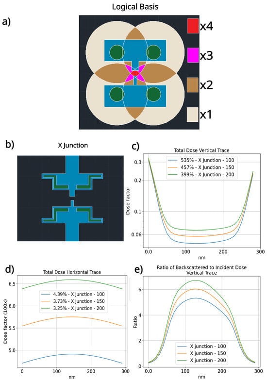 Analysis of dose factors and the ratio of the backscattered to the total incident dose for the proposed geometry designed to utilize backscattered electrons for the undercut definition. (a) The logical basis to create a new geometry, specifically conceived to tailor the distribution of backscattered electrons, thereby minimizing variance across the junction area. The blue region is intended to receive the minimal necessary dose to develop the top resist layer, with backscattered electrons being generated within the green circle region by a higher dose factor. The larger circles represent a simplified model for the overlap of the backscattered regions, assuming point sources, with different colors indicating the degree of overlap. (b) X junction ggeometry designed with features to retain geometric resolution while achieving the (4:1) ratio for the (c) total deposited dose over the vertical trace. (d) Horizontal profile of the total deposited dose. (e) Ratio of backscattered to incident dose for the X junction.