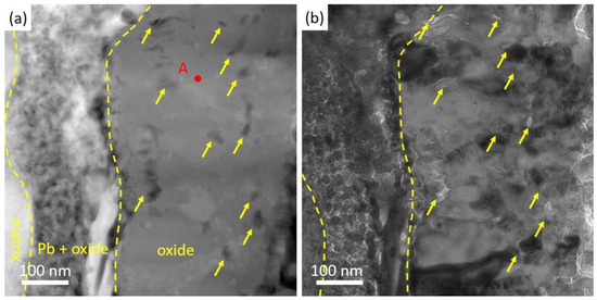 Fe oxides mixed with Pb could be seen outside the original surface, and the oxides were not continuous or adherent to the original surface. Thus, it was not recognized as the outer oxide layer. Furthermore, Pb penetrated the Fe, Cr oxide layer and came into contact with the steel matrix. Pb separated the steel matrix and the oxide and could lead to the further split of the oxides, which agrees well with the SEM cross-sectional analysis of Figure 3a. In Figure 5a,b, we presented both HAADF and bright field images of the same site in the oxide layer, with voids indicated by arrows. The grains of oxides were elongated and hundreds of nanometers in size. Voids were observed to sit between the oxide grains, as shown in Figure 5b with a 1000 nm under focus. An EDS point scan in Table 2 suggested that the atom ratio of Fe:Cr in the oxide was about 5:1. A selected area electron diffraction (SAED) pattern in Figure 6b indicates that the oxide scale is polycrystalline.