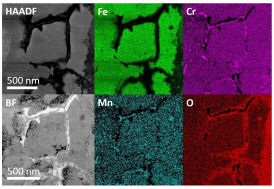 After Fe ion irradiation, as in Figure 2c,d, Cr enrichment at the grain boundary junctions as well as Cr and Mn grain boundary segregation were observed. Figure 2c was taken at a depth between 2 and 3 μm, where the damage level was 20~45 dpa. Obvious grain boundary segregation of Cr and Mn after irradiation was observed in this image. Figure 2d was taken at a depth of 250~500 nm, corresponding to a damage level of about 5 dpa. The images illustrate the Cr enrichment at the grain boundary junctions, leading to the formation of new phases rich in Cr and lack of Fe. These Cr-rich phases could be found throughout the irradiated area, independent of depth, i.e., dpa. In the whole specimen, no voids were observed due to the good swelling resistance of ODS steel. The size, composition, and distribution of nano-oxides in irradiated areas did not show differences compared to those in the as-received specimen. Nano-oxides were considered to be stable after irradiation.