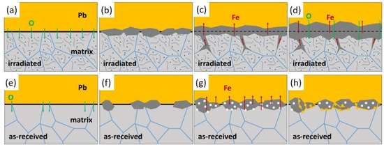 In the irradiated specimen, mass defects, such as point defects and dislocations, were produced by irradiation, indicated by dots and lines in Figure 12. They enhanced the diffusion of oxygen inside the steel matrix. Oxygen diffused faster and was more uniformly even inside the grains, as shown in Figure 12a. A continuous and compact oxide layer formed, as illustrated in Figure 12b. The amorphous structures around small grains could be the result of Fe loss, which was retarded by the outer layer of magnetite and was replenished by Fe diffused from grain boundary oxidation beneath the oxide layer, as shown in Figure 12c. Small grains observed in the inner layer also provided fast diffusion paths for oxygen. The outward diffusion of Fe and inward diffusion of oxygen through the oxide layer led to the growth of double-layer oxides as in Figure 12d. The continuous oxides did not stop the process of oxidation but prevented the penetration of Pb into the steel matrix; therefore, no Pb attack was observed in the irradiated specimen after corrosion.
